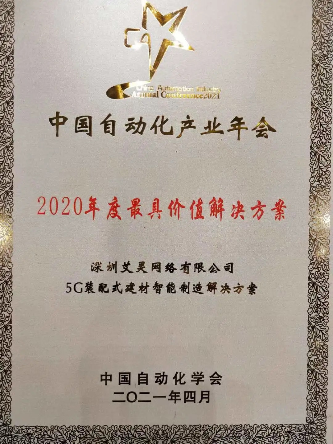 本次评选经过前期的积极推荐、专家评审、入围公布、网上投票等阶段,在多位专家的见证下,艾灵网络(AI-LINK)凭借与中国建材集团有限公司(以下简称“中建材”)联手打造的基于5G的装配式建材构件智能化生产解决方案,荣获2020 中国自动化领域年度“最具价值解决方案”这一殊荣。此次获奖不仅是行业及专家对艾灵网络企业品牌及价值、内涵等多方面得认可,也激励艾灵网络(AI-LINK)以更加专业的产品和服务为工业产业贡献一己之力。